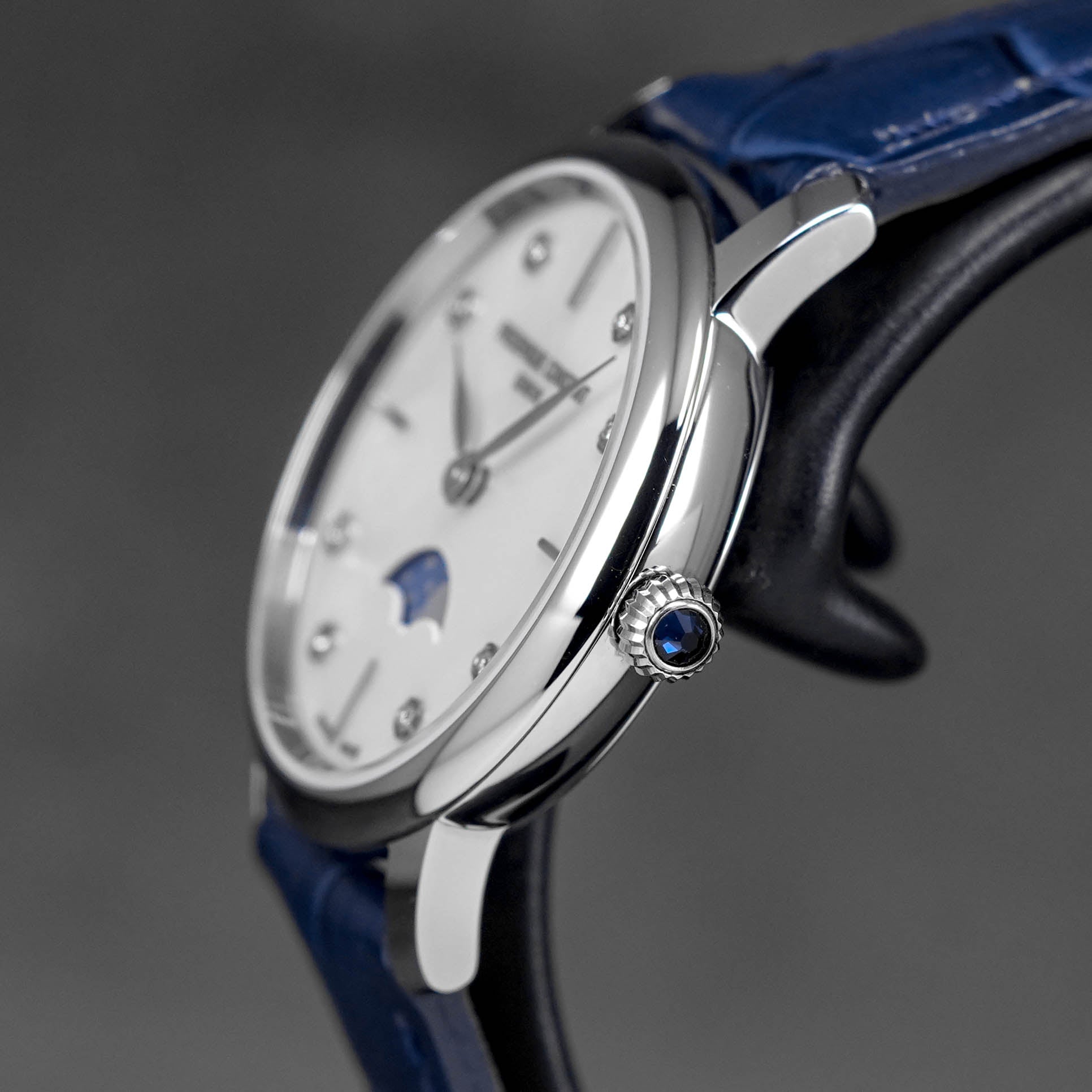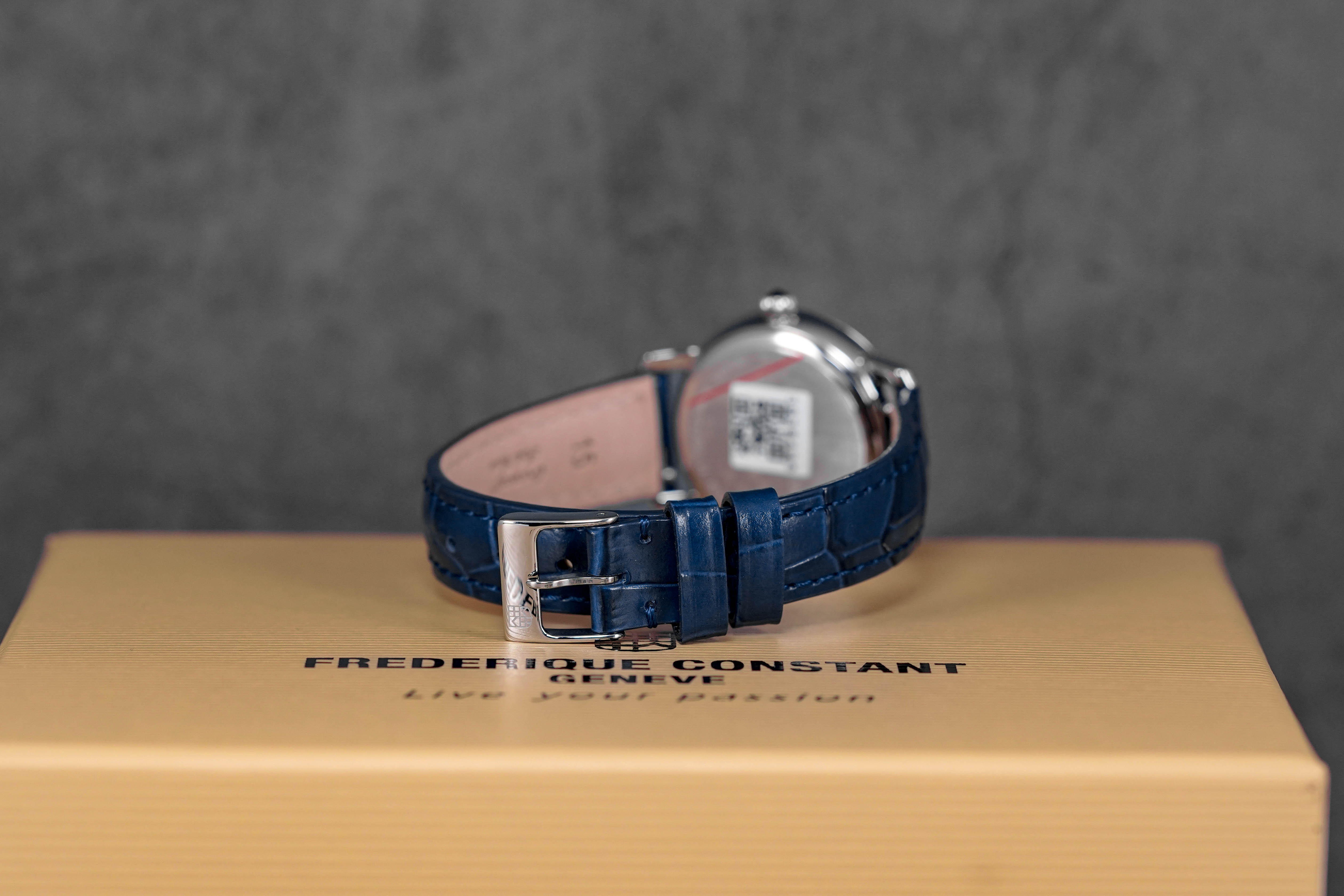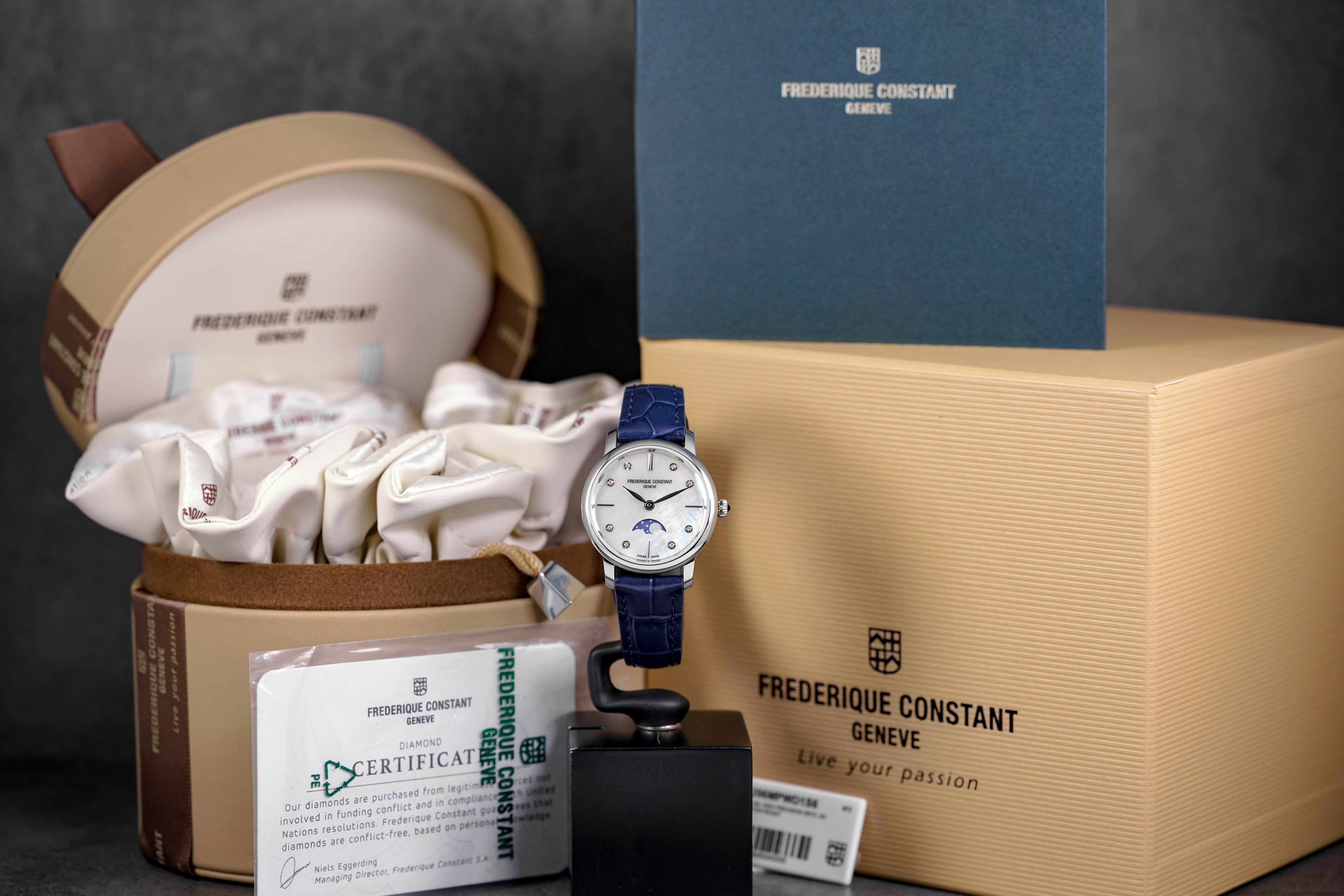 FREDERIQUE CONSTANT SLIMLINE MOONPHASE WHITE MOP DIAMOND DIAL LEATHER STRAP